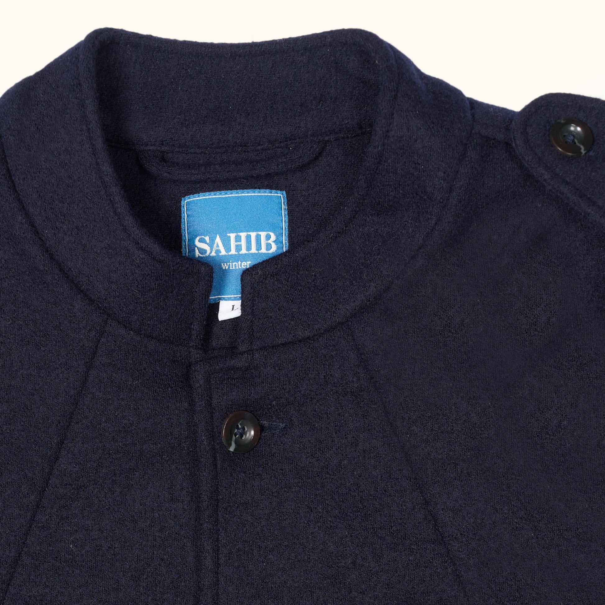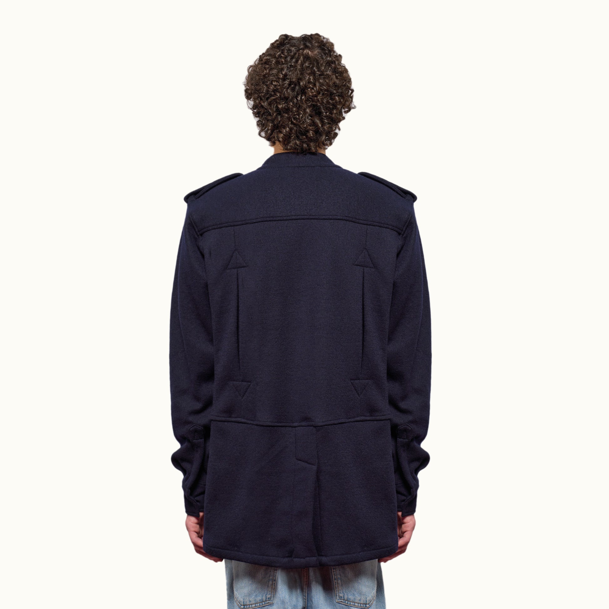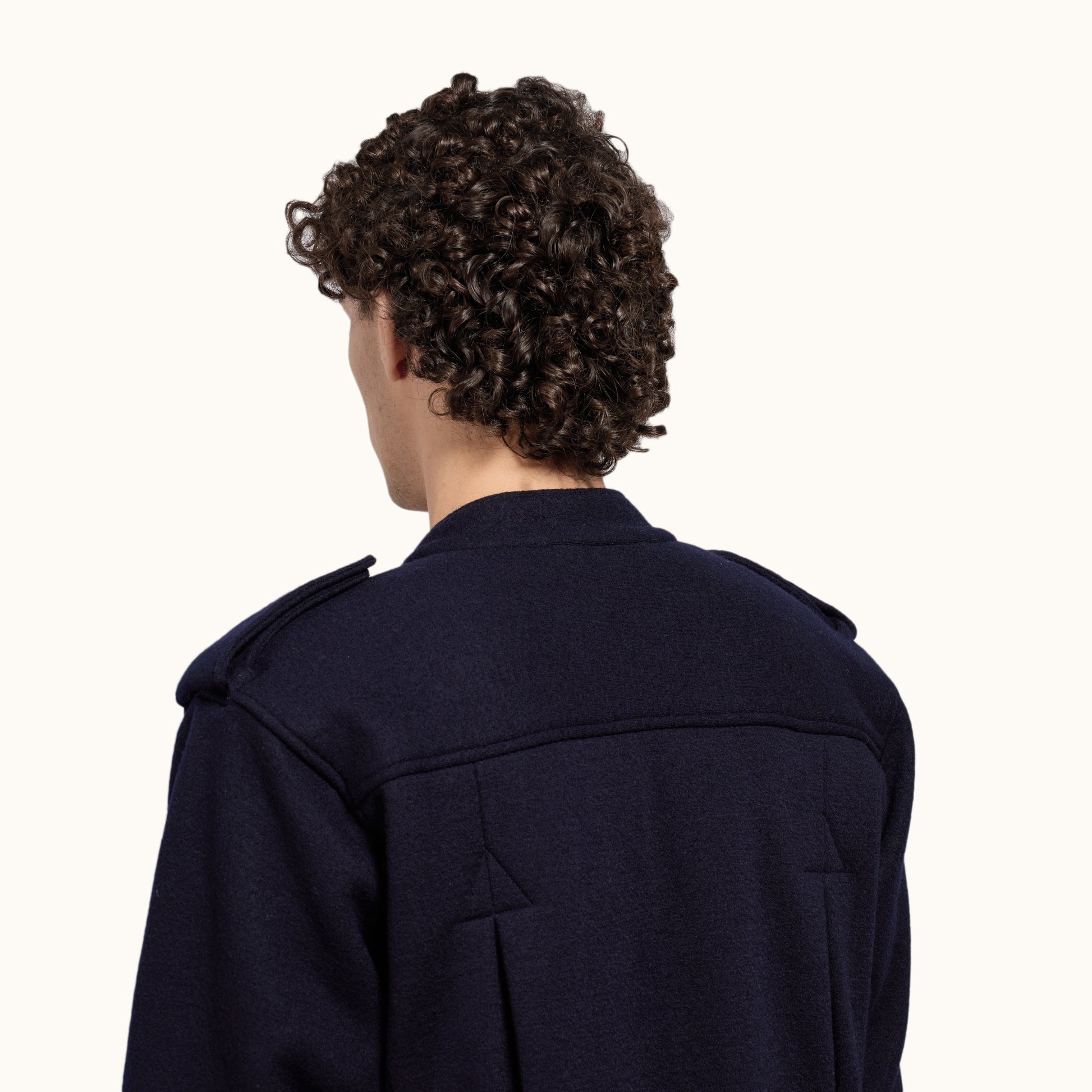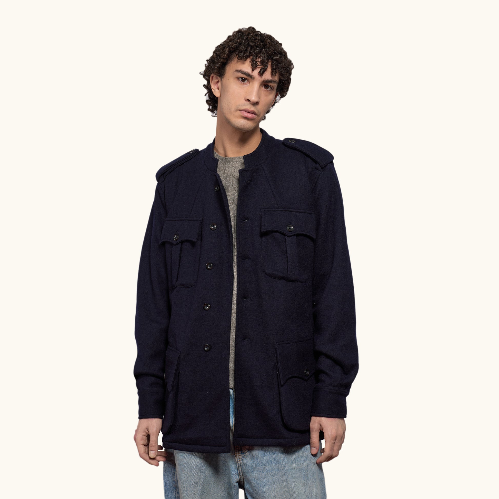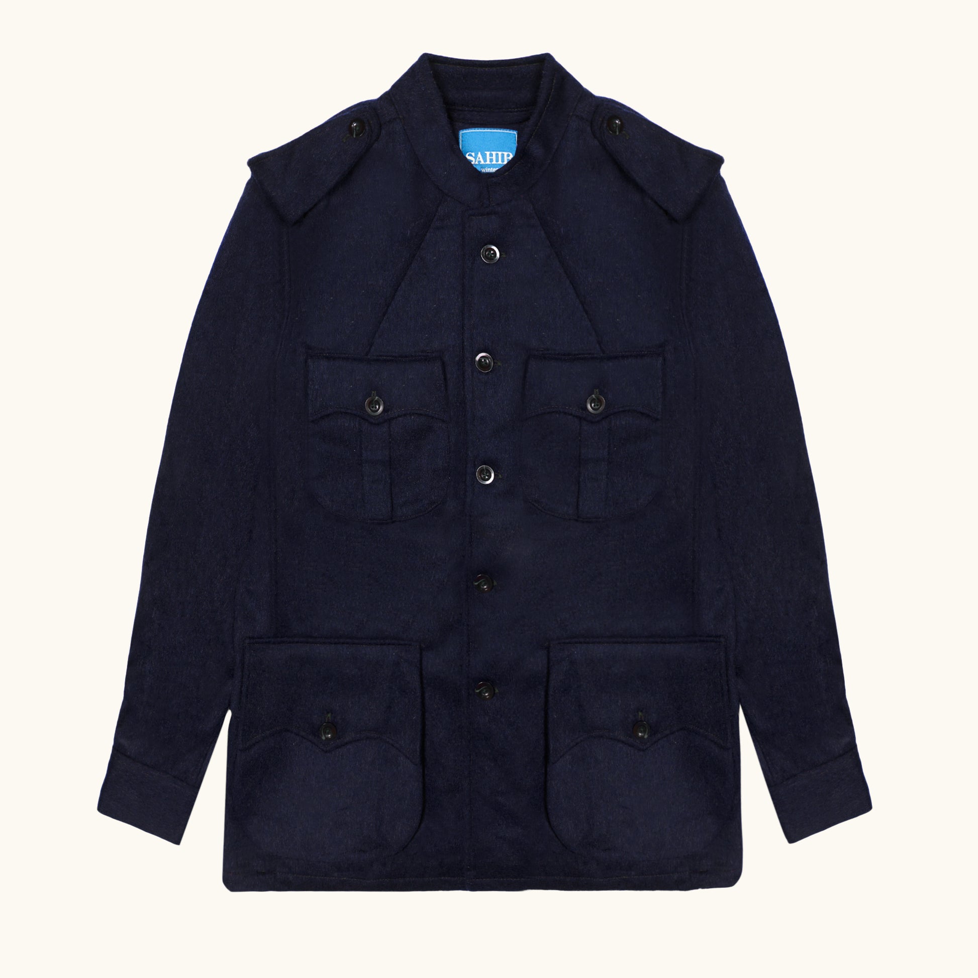 The warmest sahariana, in the chicest navy blue, made of precious Cashmere wool. It features four flap pockets, horn buttons and cuffed sleeves.